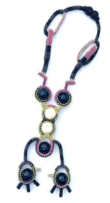 2 spherical magnets nestled into a Peyote mesh.